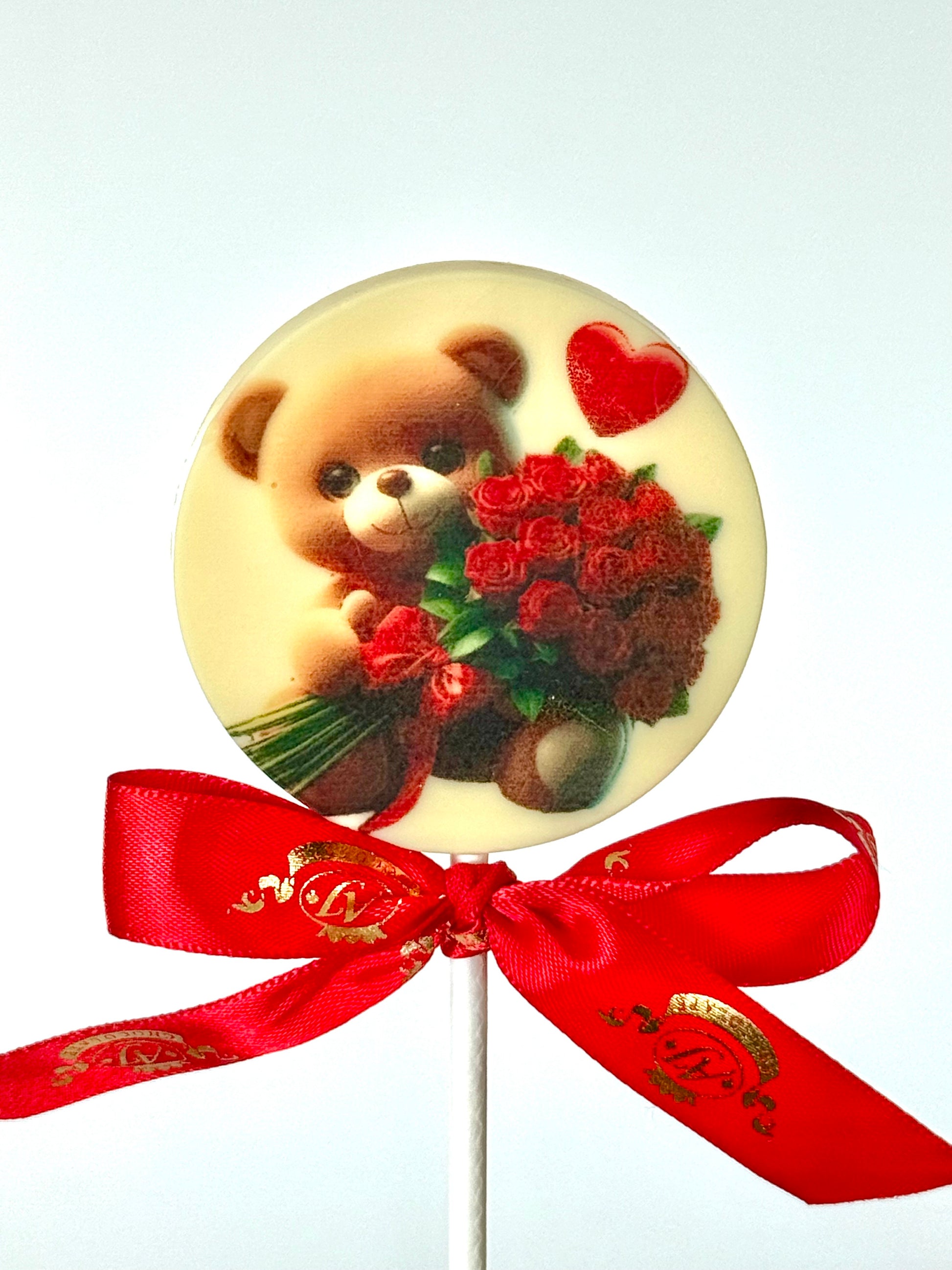 Balto šokolado "Meškiukas su rožėmis" ant pagaliuko