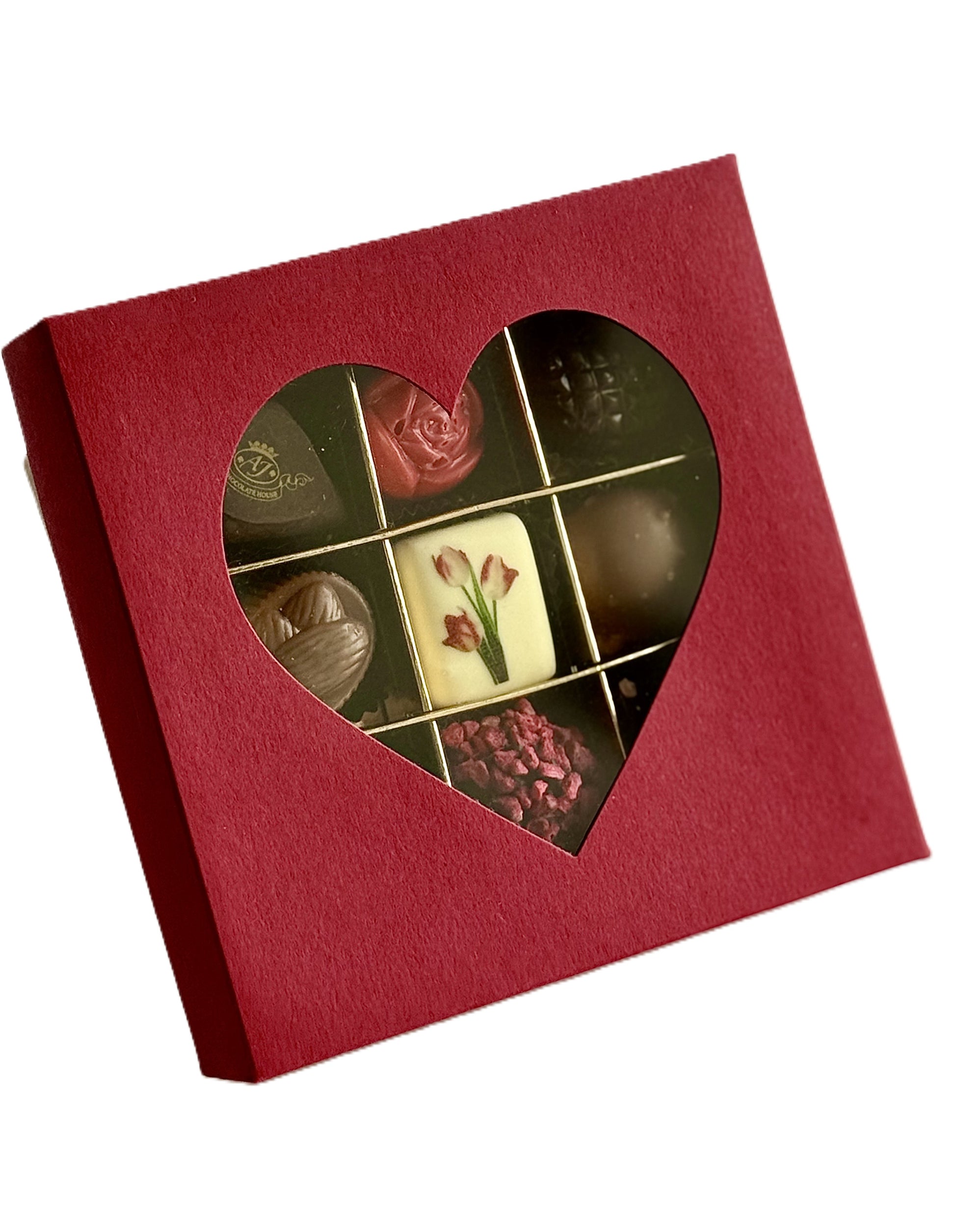 Prabangi, širdelės formos dėžutė su rankų darbo saldainiais.